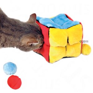 Pluszowa kostka zapewnia Waszemu kotu godzinne zabawy. Dzięki zawartymi w środku piłeczkami, Wasz kot będzie zawsze skory do zabaw. Żeby urozmaicić zabawę kotu, można tę kostkę łaczyć z innymi zabawkami lub słodkościami. Taka kostka wygląda tak-